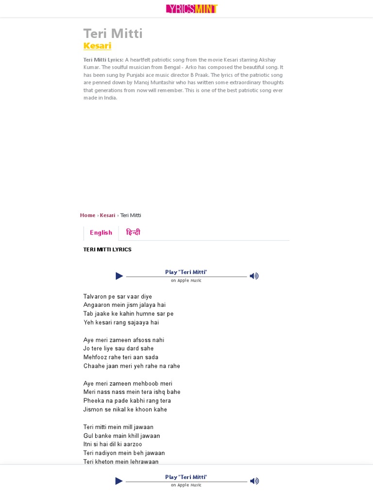 Kesari Teri Mitti Full Song Written In Hindi - Your soil) is a patriotic hindi song, written by manoj muntashir, composed by arko pravo mukherjee, and sung by singer b praak.